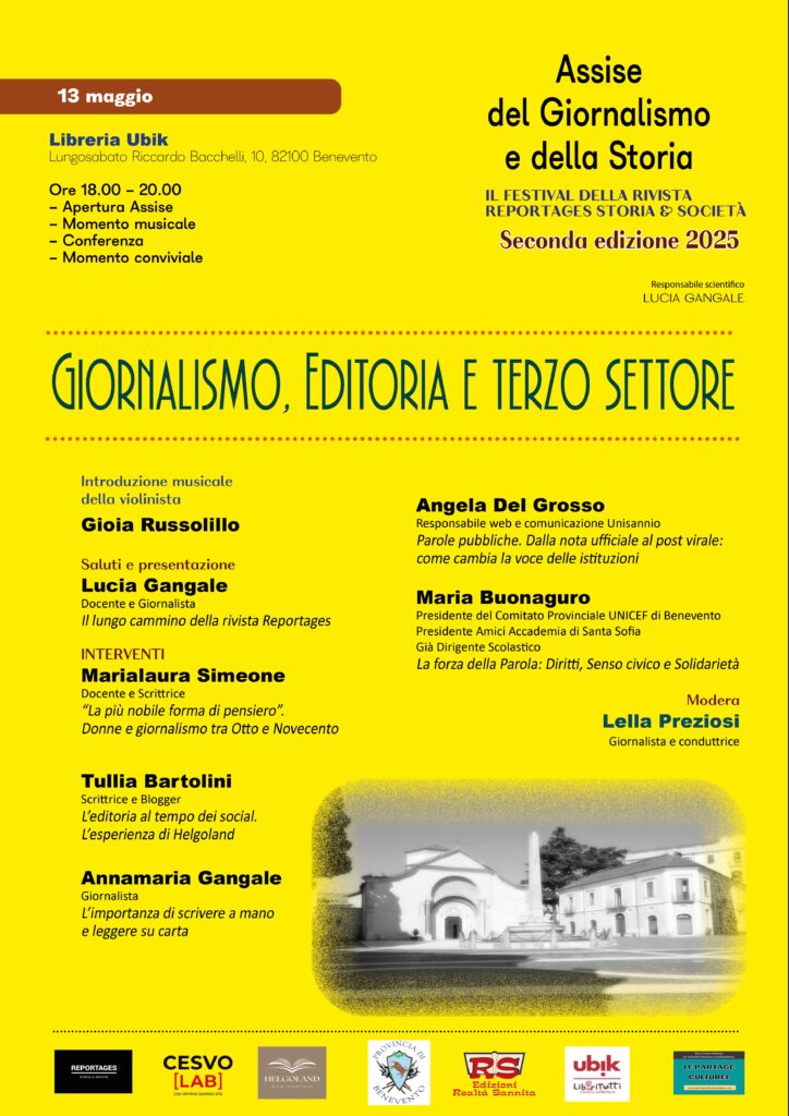 Il 13 maggio 2025, dalle 18.00 alle 20.00, la Libreria Ubik di Benevento ospiterà la seconda edizione dell’Assise del Giornalismo e della Storia, il festival della rivista Reportages. Storia & Società, con un focus speciale su Giornalismo, Editoria e Terzo Settore.