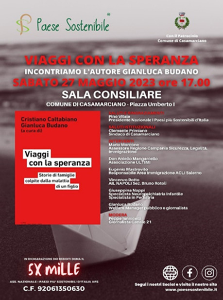 Sabato 27 maggio 2023, alle ore 17.00, presso la sala Consiliare del Comune di Casamarciano, si terrà un incontro con Gianluca Budano, autore de “Viaggi con la Speranza”. Storie di famiglie colpite dalla malattia di un figlio. Saranno presenti: Pino Vitale Presidente Nazionale, Clemente Primiano Sindaco di Casamarciano, l’Ass. Regionale alla Sicurezza, Legalità e Immigrazione Mario Morcone, Don Aniello Manganiello dell’Ass.ne Ultimi, Eugenio Mastrovito, Responsabile Immigrazione ACLI Salerno, Vincenzo Botto di AIL Napoli, Giuseppina Nappi, specialista Neuropsichiatria Infantile e Pediatria, Gianluca Budano Welfare Manager, Autore e giornalista. Il dibattito sarà moderato da Peppe Iannicelli, giornalista di Canale 21.