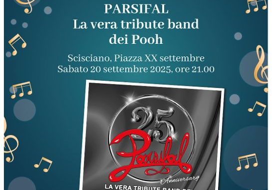 Si conclude la rassegna “Scisciano in Festa”, kermesse di cultura e spettacolo inserita nel Cartellone degli Eventi Metropolitani 2024-2025” e organizzata dall’Amministrazione Comunale di Scisciano con lo spettacolo musicale dei “Parsifal”, la vera tribute band dei Pooh, tra i più iconici gruppi italiani. Il concerto gratuito si terrà sabato 20 settembre 2025, a partire dalle ore 21.00, in Piazza XX settembre a Scisciano (NA). Con 25 anni di attività live alle spalle “Parsifal” è la tribute band che, in Italia, è considerata l’unico e reale prosieguo dell’attività artistica dei Pooh. Uno status confermato dalla stessa storica band. Lo spettacolo musicale sarà, dunque, la degna conclusione della lunga progettualità voluta dal Sindaco di Scisciano, Antonio Gladenoro Clavino Ambrosino e dall’Assessore alla Cultura
