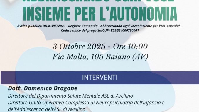 Baiano (AV), 3 ottobre 2025 – Si terrà sabato 3 ottobre, alle ore 10:00 presso la sede di Equilibrium Cooperativa Sociale in Via Malta 105 a Baiano, l’evento “Abbracciando ogni voce: insieme per l’autonomia”, promosso nell’ambito dell’Accordo per la Coesione della Regione Campania e finanziato con la Delibera CIPESS n. 70/2024.