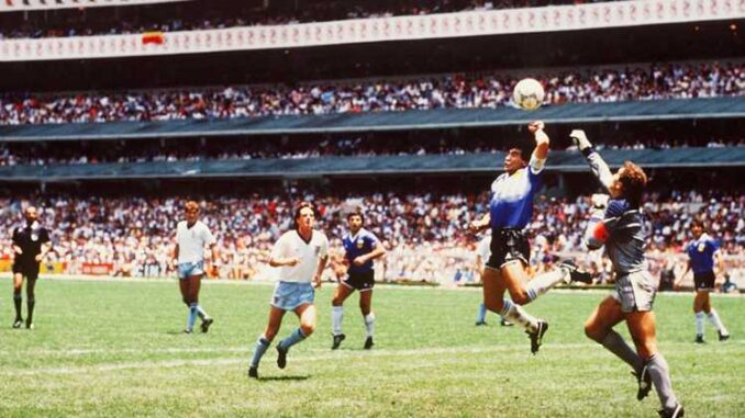 Al minuto 51, Maradona approfitta di un rimpallo e, saltando in aria con il portiere inglese Peter Shilton, colpisce il pallone con la mano sinistra e lo manda in rete. L’arbitro non vede il fallo e convalida il gol. A fine partita, Maradona dichiarerà che quella rete è stata segnata “un poco con la testa, un poco con la mano di Dio”, frase destinata a entrare nel mito.