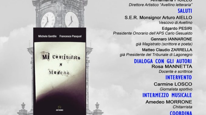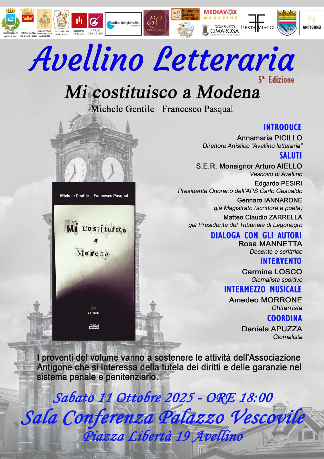 La Nazionale Italiana Poeti, associazione sportiva-culturale no profit, ospite ad Avellino letteraria, sabato 11 ottobre alle 18, presso il Palazzo Vescovile. Michele Gentile e Francesco Pasqual, ideatore e presidente della Federazione calciatori poeti, presentano: “Mi costituisco a Modena”. Più di quaranta poesie, una sintesi di tante emozioni ed esperienze vissute nelle carceri. Un laboratorio promosso con successo in numerose case circondariali, da Velletri, Lorusso e Cutugno di Torino, alla casa di reclusione di Bollate Milano. ‘Versi Liberi’ è più di un semplice laboratorio di poesia, rappresenta un punto di contatto tra sensibilità diverse e nello stesso tempo urgenza di sensibilità. È riuscito in questi anni a creare, attraverso lo strumento della poesia, importanti momenti di pura condivisione tra i volontari, i detenuti e molto spesso gli Operatori Penitenziari. Ragazzi che hanno riconosciuto i propri errori, e attraverso la poesia creano un ponte, facendo sentire la propria voce per riconciliarsi con il mondo esterno ed i propri cari, cercando di assottigliare i fili dell’emarginazione. Introduce la serata la direttrice artistica, Annamaria Picillo. Dopo i saluti di Monsignor Arturo Aiello, vescovo di Avellino, Edgardo Pesiri, presidente onorario dell’Associazione di Promozione Sociale “Carlo Gesualdo”, Gennaro Iannarone, già magistrato, scrittore e poeta, e di Matteo Claudio Zarrella, già presidente del Tribunale di Lagonegro, interverrà Carmine Losco, giornalista sportivo. Partecipa con gli autori Rosa Mannetta, docente e scrittrice. Intermezzo musicale a cura del chitarrista, Amedeo Morrone. A coordinare la serata, la giornalista Daniela Apuzza. L’intero ricavato del libro, andrà a sostenere le attività dell’associazione Antigone, impegnata nella tutela dei detenuti negli istituti penitenziari.