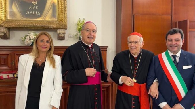 Al termine del rito, il primo cittadino ha incontrato il cardinale Giovanni Battista Re, decano del Collegio Cardinalizio, insieme al sottosegretario alla Presidenza del Consiglio Pina Castiello e all’arcivescovo di Pompei, Tommaso Caputo.