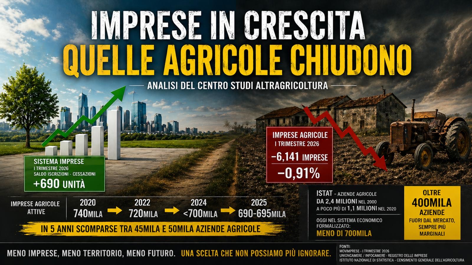 Questa lettura diventa ancora più chiara quando si mettono insieme i dati del Registro delle imprese con quelli dell’Istituto Nazionale di Statistica. Secondo ISTAT, le aziende agricole italiane erano circa 2,4 milioni nel 2000 e poco più di 1,1 milioni nel 2020. Oggi, però, quelle pienamente inserite nel sistema economico formalizzato sono meno di 700mila. La distanza — oltre 400mila aziende — non è una contraddizione statistica, ma la rappresentazione di una frattura reale.