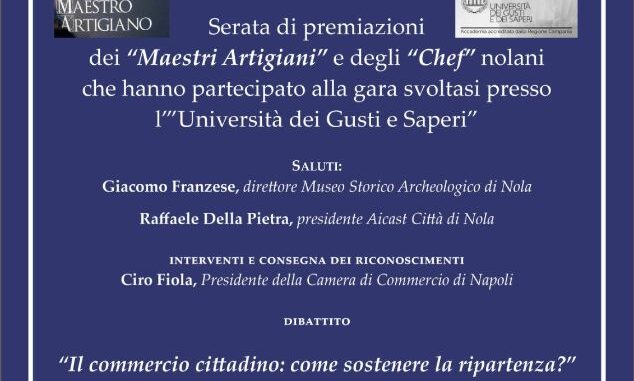 Si svolgerà giovedì 26 maggio alle ore 18.30, presso il Museo storico archeologico di Nola, la serata di premiazioni dei “Maestri Artigiani” e degli Chef nolani che hanno partecipato alla gara presso l’università dei “Gusti e dei saperi”.