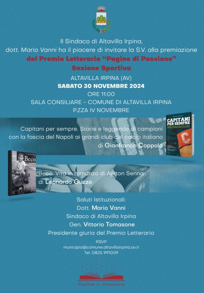 Dopo il successo delle passate edizioni, il Premio Letterario “Pagine di Passione” è destinato a tornare in una veste rinnovata. Sabato 30 novembre, infatti, la sala consiliare di Altavilla Irpina ospiterà, per la prima volta, la premiazione della sezione dedicata alle pubblicazioni sportive. Il Premio prende ispirazione dalle intense pagine de “Il marito di Elena”, romanzo di Giovanni Verga ambientato proprio ad Altavilla Irpina. Al centro della kermesse letteraria il tema delle passioni umane, della felicità e infelicità domestica, dei sogni nutriti e poi infranti. Ad aggiudicarsi il premio, quest’anno, sono stati Gianfranco Coppola, con “Capitani per sempre. Storie e leggende di campioni con la fascia. Dal Napoli ai grandi club del calcio italiano”, e Leonardo Guzzo, autore di “Beco. Vita in romanzo di Ayrton Senna”. I vincitori riceveranno le attestazioni dalle mani del dott. Mario Vanni, sindaco di Altavilla Irpina, e del Generale Vittorio Tomasone, Presidente della Giuria. (Andrea Squittieri).