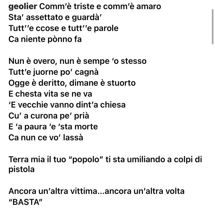 “Terra mia il tuo popolo ti sta umiliando a colpi di pistola” aggiunge Geolier alla sua caption dopo aver citato “Terra mia” di Pino Daniele.