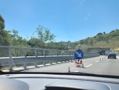 Per questo motivo, abbiamo percorso in automobile il tratto di autostrada da Grottaminarda fino alla confluenza con l’autostrada A14, constatando un’infinità di lavori in corso, con continui passaggi da una corsia all’altra e lunghi tratti a doppio senso di circolazione, separati solo da indicatori in plastica.