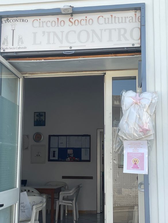 Un agile collage, realizzato con finezza da Carlo Melissa, che suona e rispecchia i sentimenti di buon augurio per Gaetana Emilia e di vive felicitazioni per il papà, Felice DAnna, e la madre, Giusy De Laurentiis, che vivono da sempre  in modo attivo e con piena  disponibilità le iniziative e le attività socio-culturali sia di Proteatro, importante esperienza di cooperativa sociale di produzione e servizi, che de LIncontro e della Pro Loco. E non a caso, i fiocchi spiccano nella bacheca-tribuna  di Proteatro e sulle porte-vetro de LIncontro e della Pro Loco.