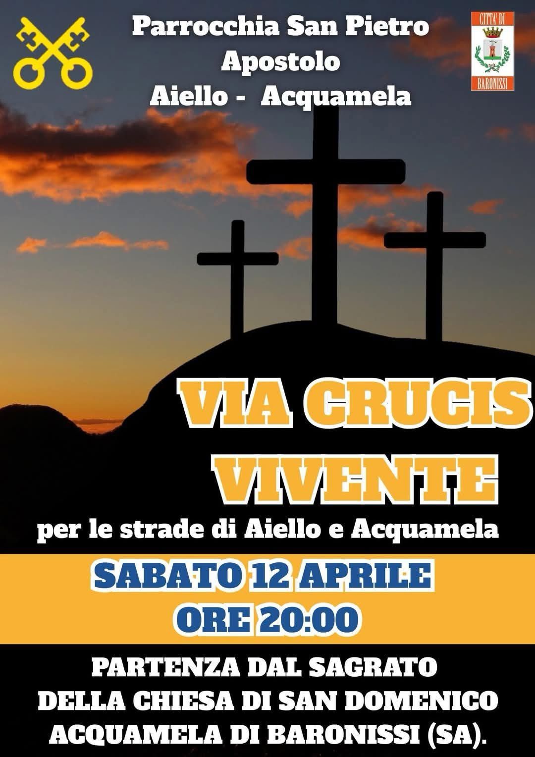 Torna questa sera, sabato 12 aprile, uno degli appuntamenti più sentiti dalla comunità di Baronissi: alle ore 20:00 prenderà il via ad Acquamela la Via Crucis Vivente, organizzata dalla Parrocchia di San Pietro Apostolo. La rappresentazione partirà dal sagrato della Chiesa di San Domenico e si snoderà lungo le strade di Aiello e Acquamela, trasformando il centro cittadino in un suggestivo scenario di fede e raccoglimento.
