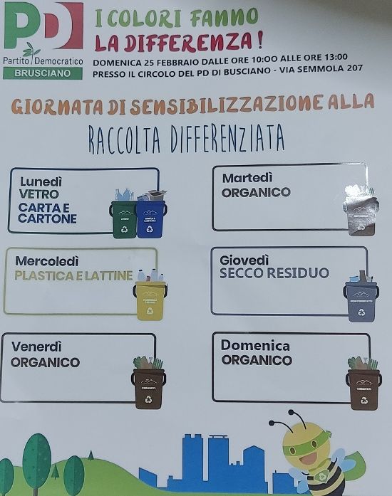 Domenica 25 febbraio 2024, intesa come “Giornata di Sensibilizzazione della Raccolta Differenziata”, il PD ha distribuito alla cittadinanza un volantino intitolato “I Colori fanno la Differenza” riproducendo i giorni della settimana con i corrispondenti distinti conferimenti dei rifiuti solidi urbani raccolti poi dagli efficienti operatori del servizio pubblico del Comune di Brusciano: Lunedì, Vetro, Carta e Carone; Martedì, Organico; Mercoledì Plastica e Lattine; Giovedì, Secco Residuo; Venerdì, Organico; Domenica, Organico. Inoltre sono stati rammemorati gli obblighi di legge che vietano ad ognuno: di dare fuoco a qualsiasi genere di rifiuto; di utilizzare i contenitori di rifiuti altrui; di abbandonare rifiuti in qualsiasi posto non autorizzato.