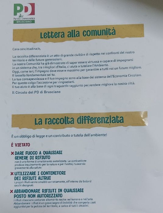 Nello stesso volantino il PD ha riprodotto una propria “Lettera alla Comunità” rivolgendosi ad ogni bruscianese con queste parole: «Cara concittadina/o, La raccolta differenziata è un atto di grande civiltà e di rispetto nei confronti del nostro territorio e delle future generazioni. La nostra Comunità ha già dimostrato di saper essere virtuosa e capace di impegnarsi in un sistema che, tra i migliori in Italia, ci aiuta a tutelare l’ambiente. Oggi, come ieri, l’impegno deve essere massimo per garantire a tutti noi un futuro migliore. Il tassello fondamentale sei tu. La tua consapevolezza e il tuo impegno sono alla base del sistema dell’Economia Circolare. Per questo colgo l’occasione per ringraziarti. Il tuo aiuto è alla base di ogni traguardo raggiunto per rendere migliore la nostra città. Il Circolo del PD di Brusciano».