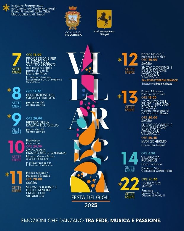 Qui, sotto la guida del capoparanza Angelo Mocerino “’O Piscatore”, la Gioventù bruscianese contribuisce alla costruzione del Giglio, affidata agli artigiani diretti da Giovanni Vecchione “Bebè”, rivestito con il progetto artistico di Rocco Micalessi già impiegato a Brusciano nel 2024. La Festa di Villaricca, dedicata ai Santi Rocco, Gennaro e Maria Santissima, si svolgerà dal 7 al 22 settembre 2025, con un ricco cartellone finanziato dalla Città Metropolitana di Napoli e promosso dall’amministrazione comunale guidata dal sindaco Francesco Gaudieri e dal vicesindaco Giovanni Granata, in collaborazione con Antonio Topo.