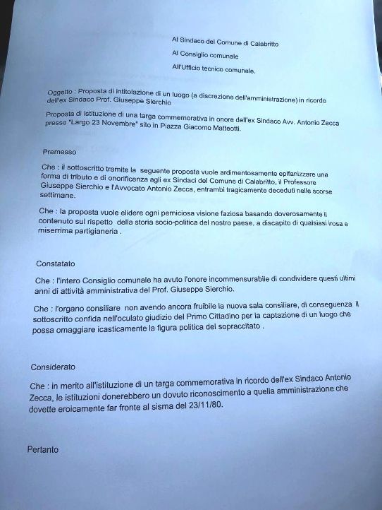 Questa mattina durante la seduta consiliare, il Consigliere Comunale di Minoranza Giuseppe D’Alessio nel discettare ha presentato la seguente proposta consiliare per l’intitolazione di un luogo (a discrezione dell’amministrazione) in ricordo dell’ex Sindaco Prof. Giuseppe Sierchio.
