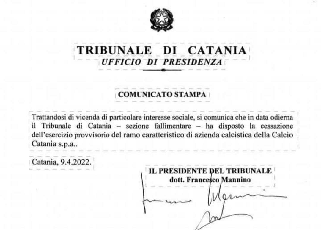 In merito alla cessazione dell’esercizio provvisorio del fallimento della società Calcio Catania, oggi disposta dal Tribunale della città etnea, il Presidente della Lega Pro Francesco Ghirelli dichiara: “Innanzitutto esprimo il massimo rispetto per l’operato della curatela e del giudice fallimentare. Con grande dolore debbo constatare che la cessazione dell’esercizio provvisorio nel corso di svolgimento della stagione regolare arreca un grave nocumento al Campionato di Serie C ed è questa una situazione che, come Presidente di Lega, non avrei mai voluto vivere.