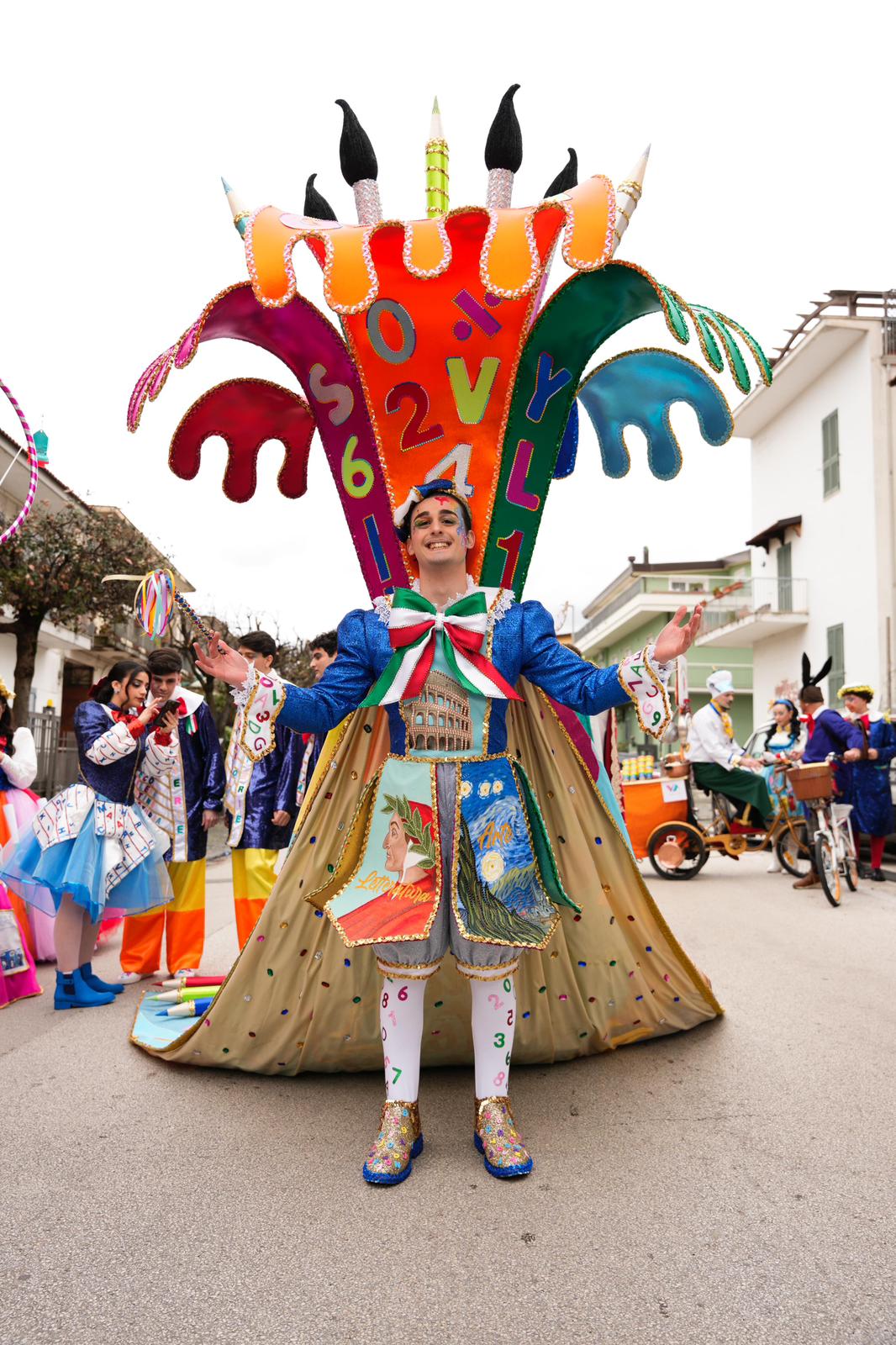 Insomma, ti stavi preparando per quest’anno! “Si può dire di sì. Il mio vestito, realizzato da Rosanna Guadagno, rappresenta lo studente modello. Indosso un grembiule ricamato costernato da una serie di pannelli che rappresentano le materie scolastiche. La struttura pesa ben 15 chili: ha la forma di un vulcano da cui fuoriesce un’ esplosione di colori. Anche il mantello è abbastanza ingombrante: ben 3 metri. Sopra è raffigurato un alunno circondato da tanti riferimenti scolastici come ad esempio Dante”