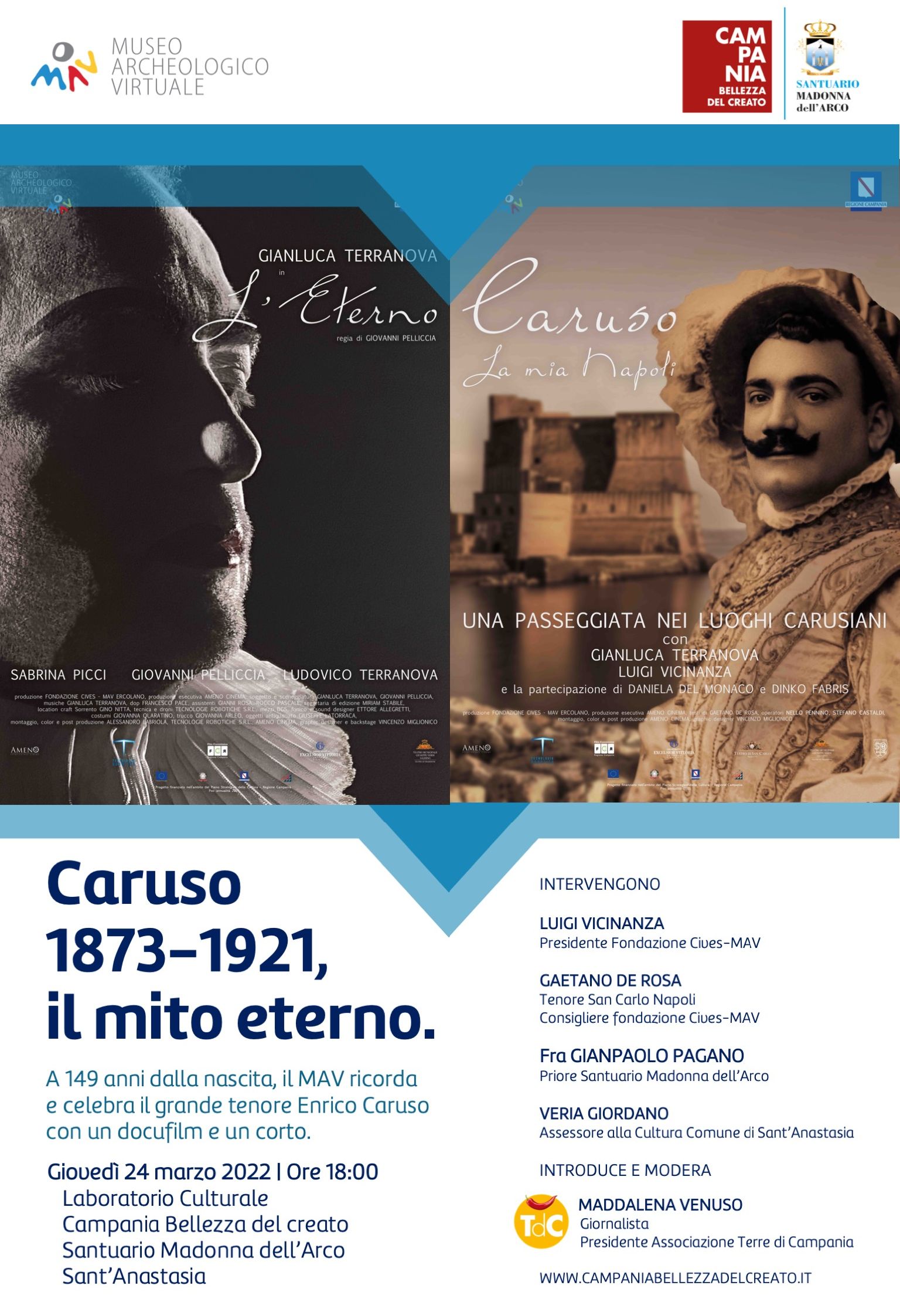 Il Laboratorio culturale di Campania Bellezza del Creato continua la sua programmazione presso il Santuario della Madonna dell’Arco di Sant’Anastasia (NA), con un evento celebrativo della figura di Enrico Caruso, il grande artista partenopeo di cui si sono da poco ricordati i cento anni dalla morte. Per omaggiare questa figura leggendaria, l’Associazione Terre di Campania APS organizza, giovedì 24 marzo 2022, alle ore 18:00, presso l’aula polifunzionale del Laboratorio culturale di Campania Bellezza del Creato, un evento celebrativo dal titolo “Caruso 1873 – 1921, il mito eterno”. Durante la serata saranno proiettati il docufilm “La mia Napoli” e il corto “L’eterno”, realizzati dalla Fondazione CIVES-MAV di Ercolano, per la regia di Giovanni Pelliccia e col tenore Gianluca Terranova nel ruolo del mito canoro partenopeo. Entrambi i prodotti audiovisivi offrono una riflessione intorno alla figura di un uomo dall’esistenza di dolore, amore e poesia, indissolubilmente legato alla città di Napoli, che ha superato i pregiudizi e le barriere dello spazio e del tempo, alla conquista della gloria eterna. Enrico Caruso è, infatti, il perfetto esempio di homo faber: una leggenda di umilissime origini, fiorita dal popoloso quartiere di San Carlo all’Arena a Napoli, un uomo che con impegno, dedizione, difficoltà e sacrifici, determinazione, grazie a occasioni colte saggiamente e ad alcune persone lungimiranti incontrate lungo il cammino di vita, ha messo a frutto il proprio talento, rendendolo passione, professione redditizia, vita, patrimonio per la posterità, soprattutto grazie all’intuizione che, da antesignano, lo portò ad unire lirica e tecnologia. Artista di grande spessore e ampie vedute, in grado di fondere qualità vocale e recitazione, col suo spiccato temperamento drammatico, Caruso ha saputo rendere “corposi” i personaggi portati sulla scena, finendo col fondersi con loro, abbattendo quella naturale barriera che si frappone all’attore e al personaggio rappresentato. La proiezione dei filmati sarà preceduta da un incontro cui prenderanno parte: Luigi Vicinanza, Presidente Fondazione CIVES-MAV; Gaetano De Rosa, Tenore San Carlo di Napoli; P. Gianpaolo Pagano, Priore Santuario Madonna dell’Arco; Veria Giordano, Assessore alla Cultura Comune di Sant’Anastasia. Introduce e modera: Maddalena Venuso, Presidente Associazione Terre di Campania APS. L’ingresso è gratuito, fino ad esaurimento posti, nel pieno rispetto della vigente normativa anti-COVID19. Si ringrazia la Comunità Domenicana per il sostegno all’iniziativa.