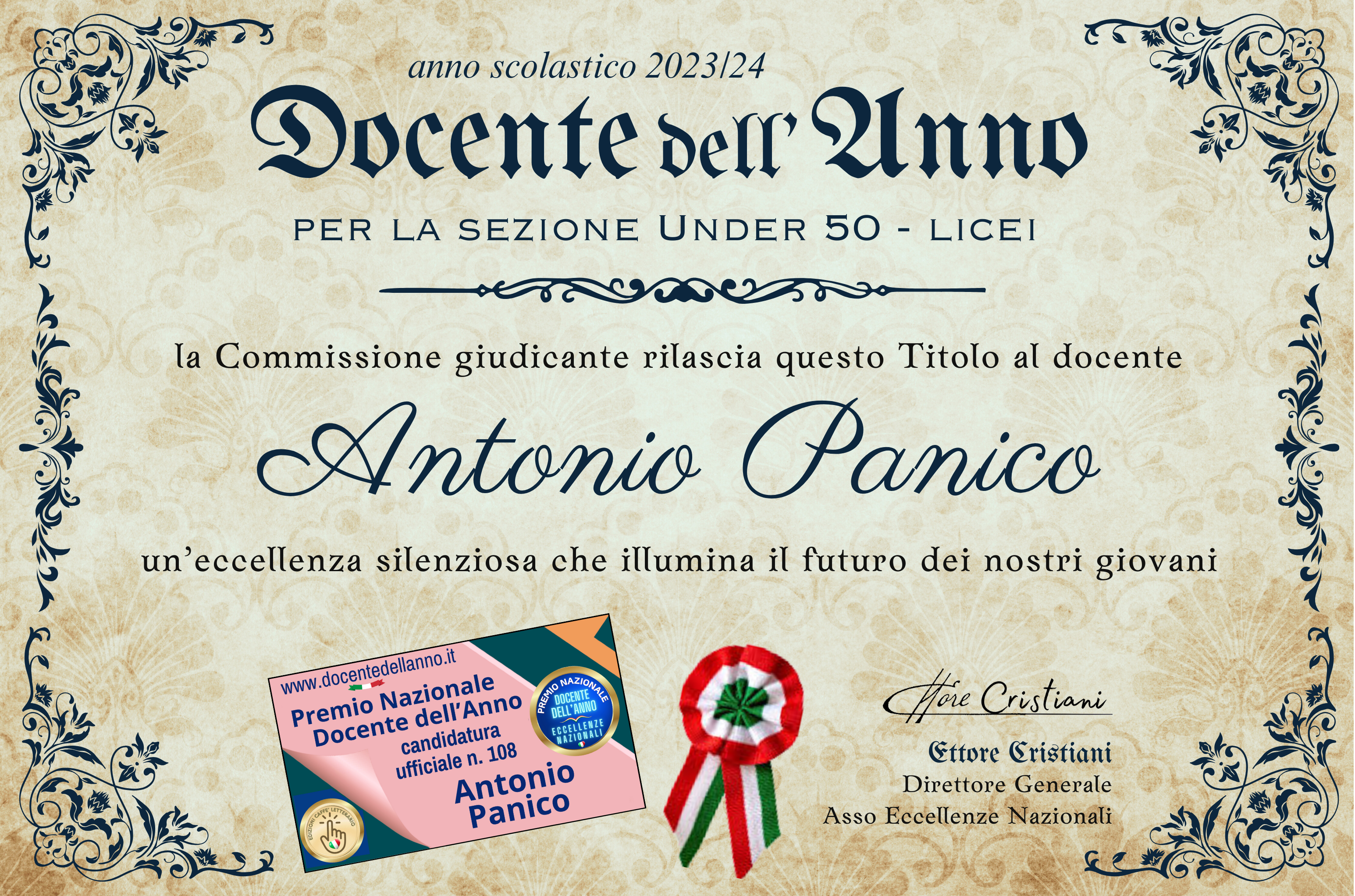 A congratularsi con lui, Roberta Cristiani, Presidente dell’Ente Gestore del Premio, che ha voluto sottolineare l’importanza di valorizzare docenti che, con il loro impegno quotidiano, rappresentano un esempio di eccellenza educativa per l’intero Paese.