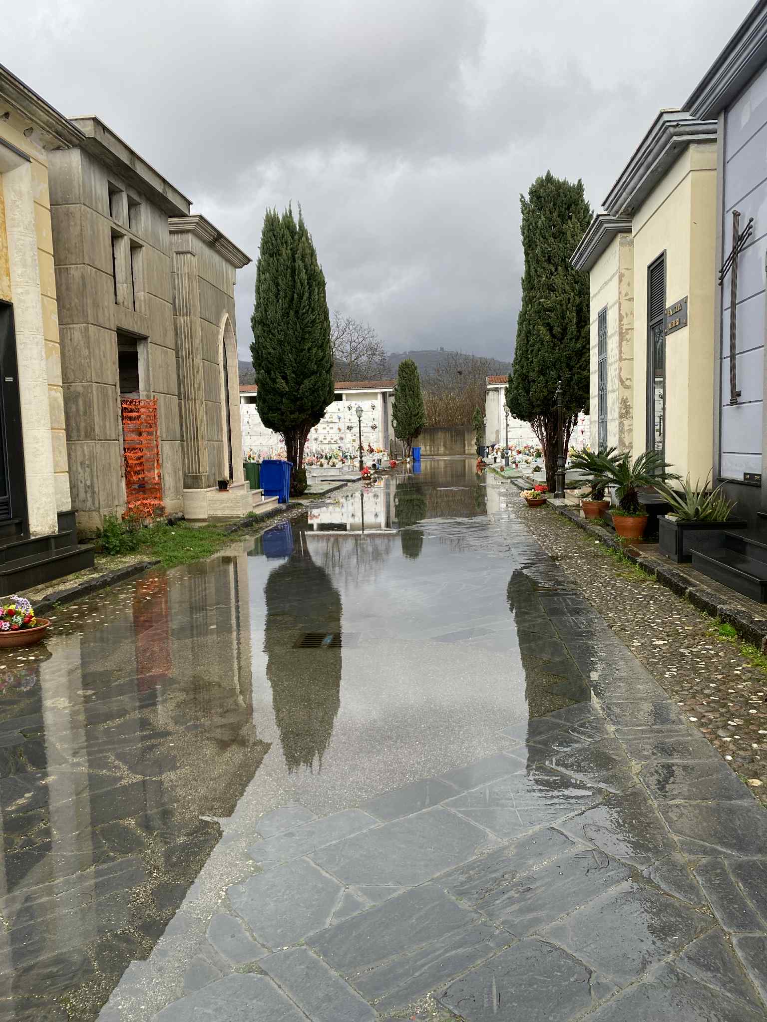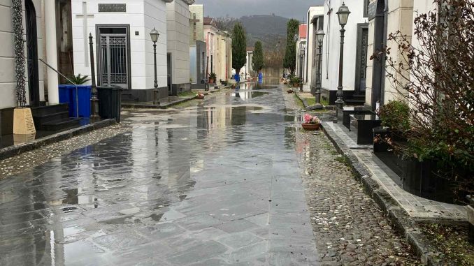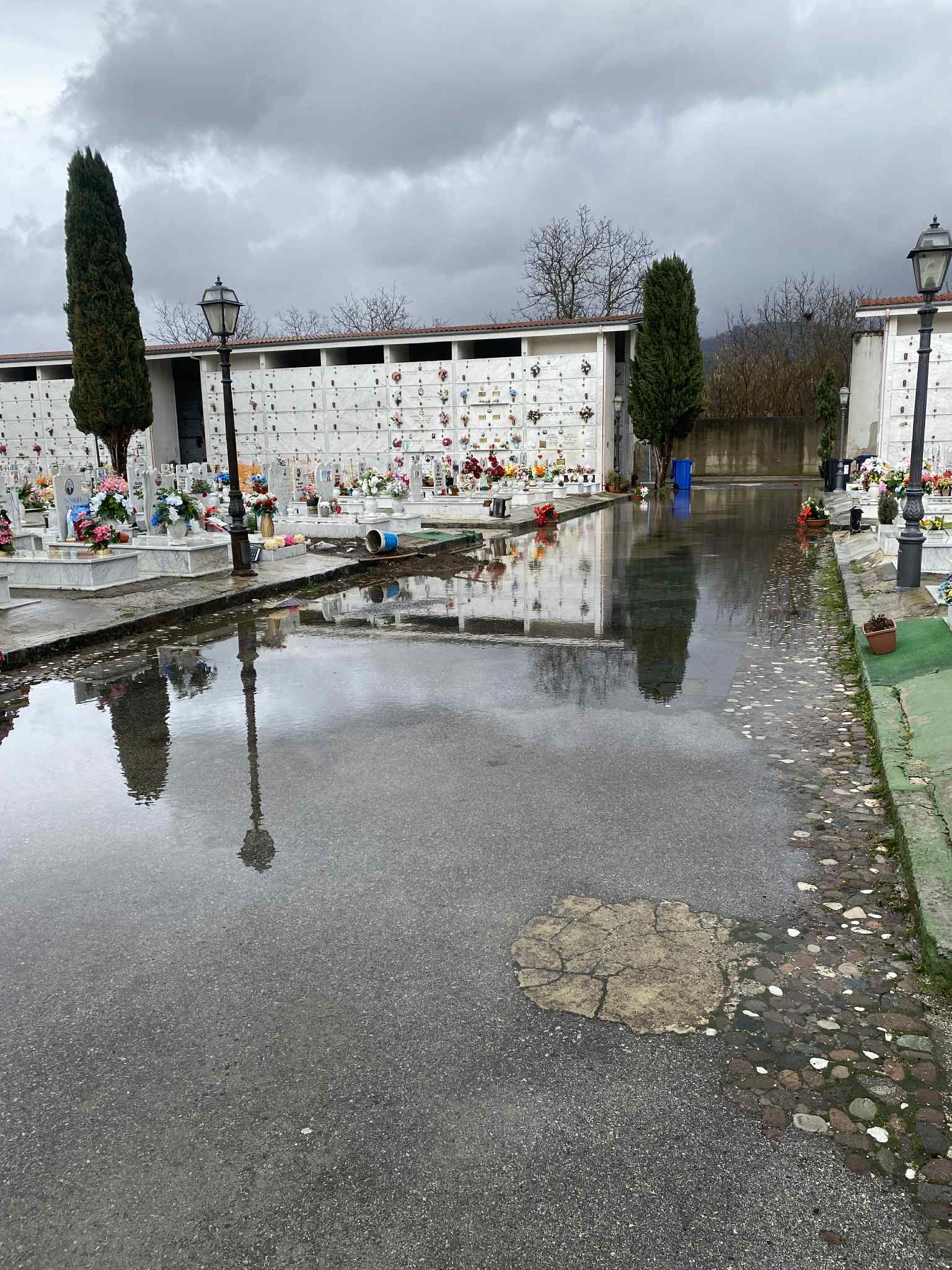 L’acqua ha invaso diversi settori del camposanto, arrivando a lambire loculi e tombe, creando una situazione di forte disagio e comprensibile amarezza. Le immagini testimoniano una condizione che si ripresenta puntualmente in occasione di piogge abbondanti, alimentando le preoccupazioni sulla tenuta del sistema di drenaggio e sulla manutenzione complessiva della struttura.