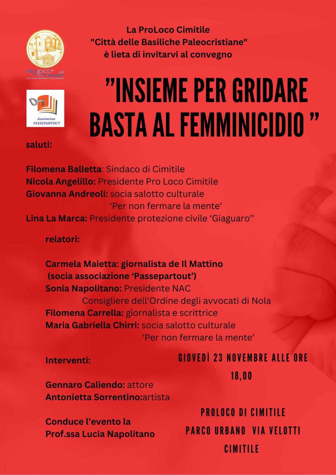 Eventi ed incontri promossi dall’Associazione NAC che mirano a sensibilizzare, informare e promuovere un confronto culturale su ogni forma di violenza. Dopo l’Istituto Carmine Russo di Cicciano e l’incontro presso l’aula Consiliare del Comune di San Gennaro Vesuviano, giovedi 23 novembre sarà la volta di Cimitile. A partire dalle ore 18.00, appuntamento con “Insieme per gridare basta al Femminicidio”, convegno che si terrà presso il Parco Urbano della Proloco di Cimitile, in via Velotti, evedrà la partecipazione delle istituzioni e numerosi relatori e giornalisti. Giovani ragazze uccise dai fidanzati, mogli accoltellate e strangolate dai mariti, scenari spettrali e atroci scene di sangue senza un perché. I dati sono sempre più allarmanti, gli episodi di femminicidio non si arrestano edall’inizio del 2023, siamo al nr. 106. Sì, perché spesso, restano solo dei numeri e delle foto mostrate sul web. Storie di donne guerriere, forti e combattive, modelli di vita e di resilienza con un’anima capace di non spezzarsi, ma pronte ad affrontare la sofferenza in nome di chi ‘dice di amarle’. Vite spezzate e sogni infranti per ‘la mano’ di uomini che trovano la propria autoaffermazione in atteggiamenti di dominio, che sono legittimati da un sistema di credenze culturali: la vera mascolinità. Come interrompere e prevenire l’innesco del ciclo alla violenza? Parlare di violenza di genere, significa smantellare le origini fortemente radicate ed informare grazie anche al supporto di enti e associazioni, con l’obiettivo di dare aiuto concreto in tutti i casi di violenza fisica e psicologica. Contro ogni forma di violenza, l’Associazione NAC quest’anno ha intensificato e programmato una progettualità itinerante che ha avuto un percorso spalmato nell’intero anno e che vede la sua conclusione in eventi di chiusura dedicati al contrasto alla violenza di genere e alla prevenzione di ogni forma di violenza, partendo dagli istituti scolastici, passando per gli enti comunali. Protagonisti i giovani studenti, cittadini dell’attuale società che non fornisce dati confortanti. “Le ultime notizie di cronaca sono davvero preoccupanti _ afferma l’avvocato Sonia Napolitano, Presidente Associazione NAC- Sono da tempo impegnata con i giovani e per i giovani. C’è assoluto bisogno di mettere in atto un programma preventivo, informativo e cautelativo del fenomeno. Partendo dal territorio, con una didattica sperimentale e coinvolgente, dobbiamo sensibilizzare gli studenti che sono recettori attivi e attivisti. Fondamentale è la collaborazione e l’interazione tra le istituzioni che sono presenti in questa campagna, mettendo a disposizione ogni forma di supporto, legate da un intento comune, quale il contenimento del problema”. Promuovere un’azione collettiva per il cambiamento sociale, attraverso la conoscenza e la comprensione è il primo passo per arrestare lo sgomento di fronte alla violenza distruttiva che umilia e disconosce il valore della vita delle persone e la libertà delle donne.