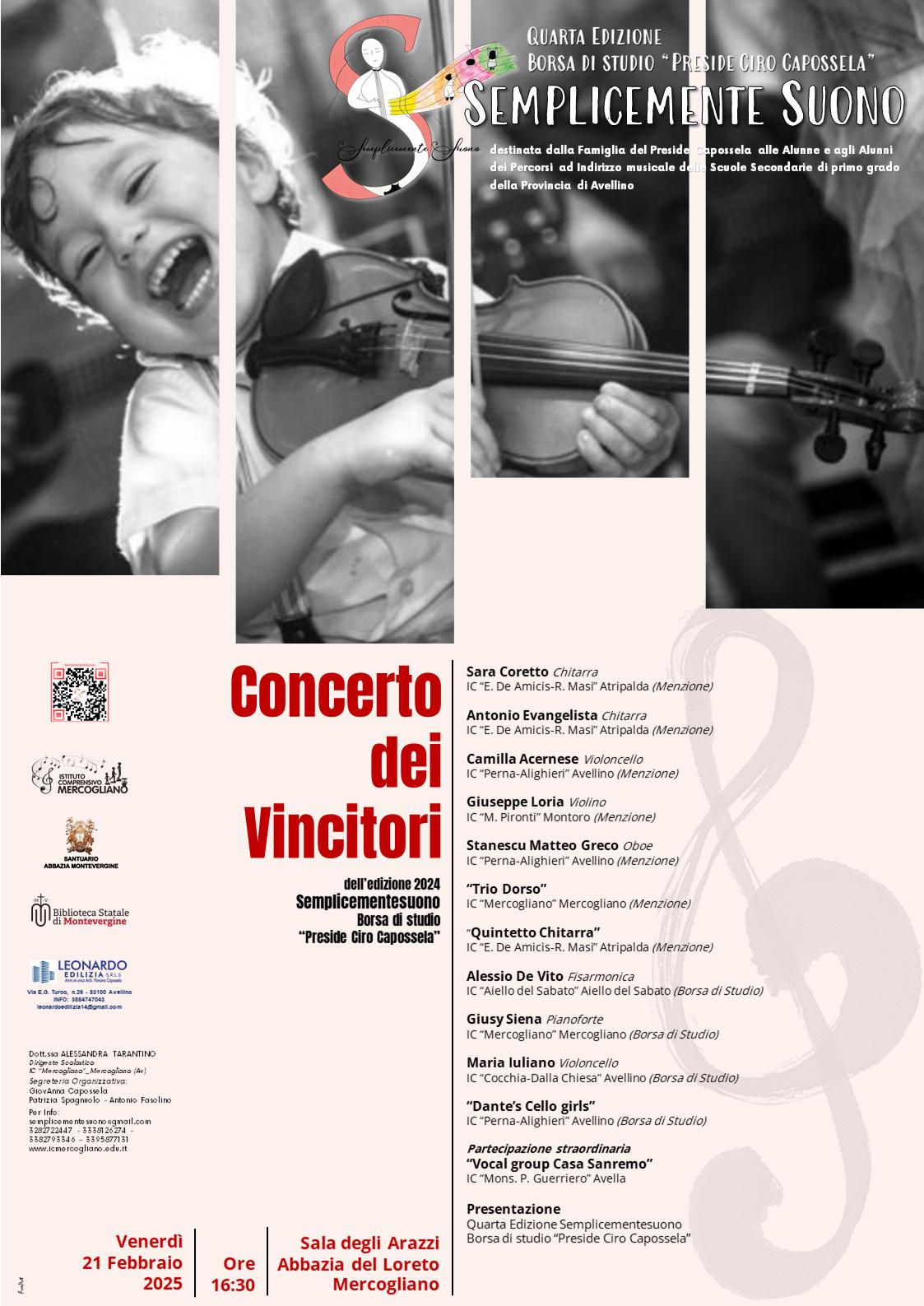 La Sala degli Arazzi dell’Abbazia del Loreto di Mercogliano ospiterà il 21 febbraio 2025, alle 16:30, il Concerto dei Vincitori della quarta edizione della borsa di studio “Preside Ciro Capossela”, nell’ambito del progetto Semplicemente Suono.