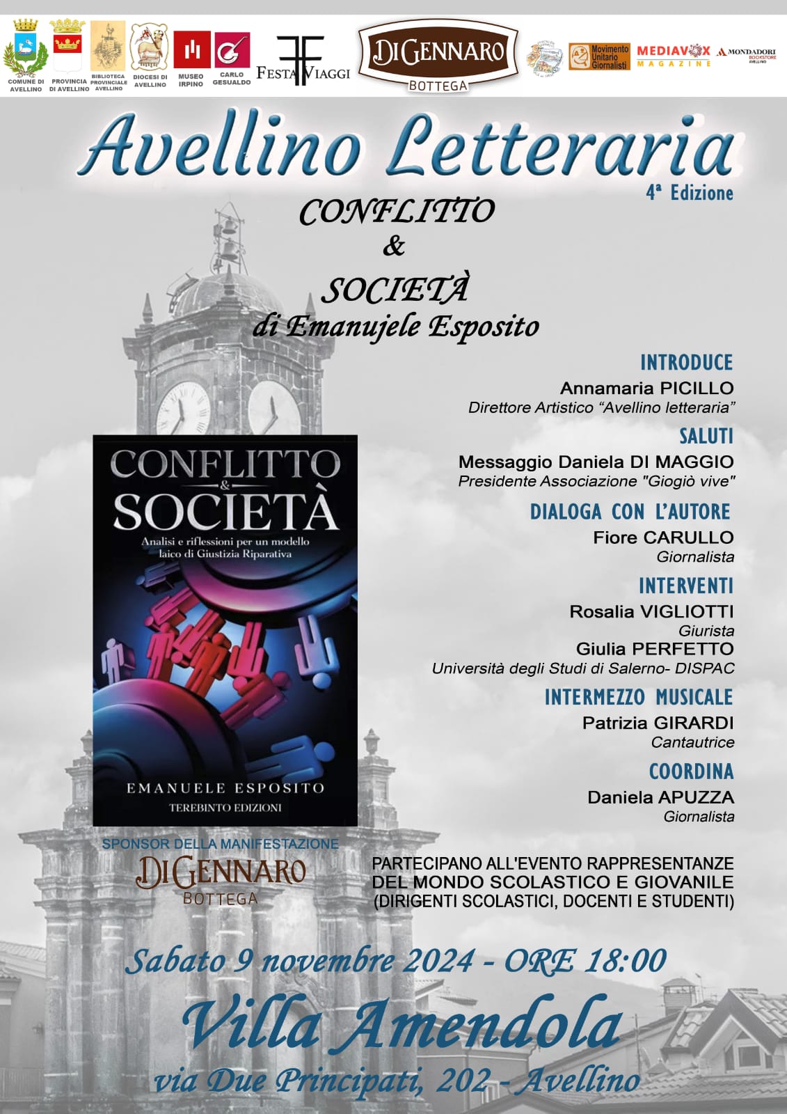 Sabato 9 novembre alle 18, presso la storica villa Amendola, un nuovo appuntamento di Avellino letteraria. Ospite, l’autore Emanuele Esposito, presenta il libro: “Conflitto e società”, edizioni Terebinto. Un saggio di analisi e riflessioni, per un modello laico che ha lo scopo di fornire una visione per ciò che riguarda la fenomenologia della giustizia riparativa e le potenzialità che dall’esercizio della stessa ne derivano. Dopo l’introduzione del direttore artistico, Annamaria Picillo, ed i saluti del presidente dell’associazione “Giogiò vive”, Daniela Di Maggio, interverranno il giurista, Rosalia Vigliotti e Giulia Perfetto, docente dell’Università degli Studi di Salerno. Partecipa con l’autore il giornalista, Fiore Carullo. Intermezzo musicale a cura della cantautrice Patrizia Girardi. Coordina l’evento la giornalista Daniela Apuzza.