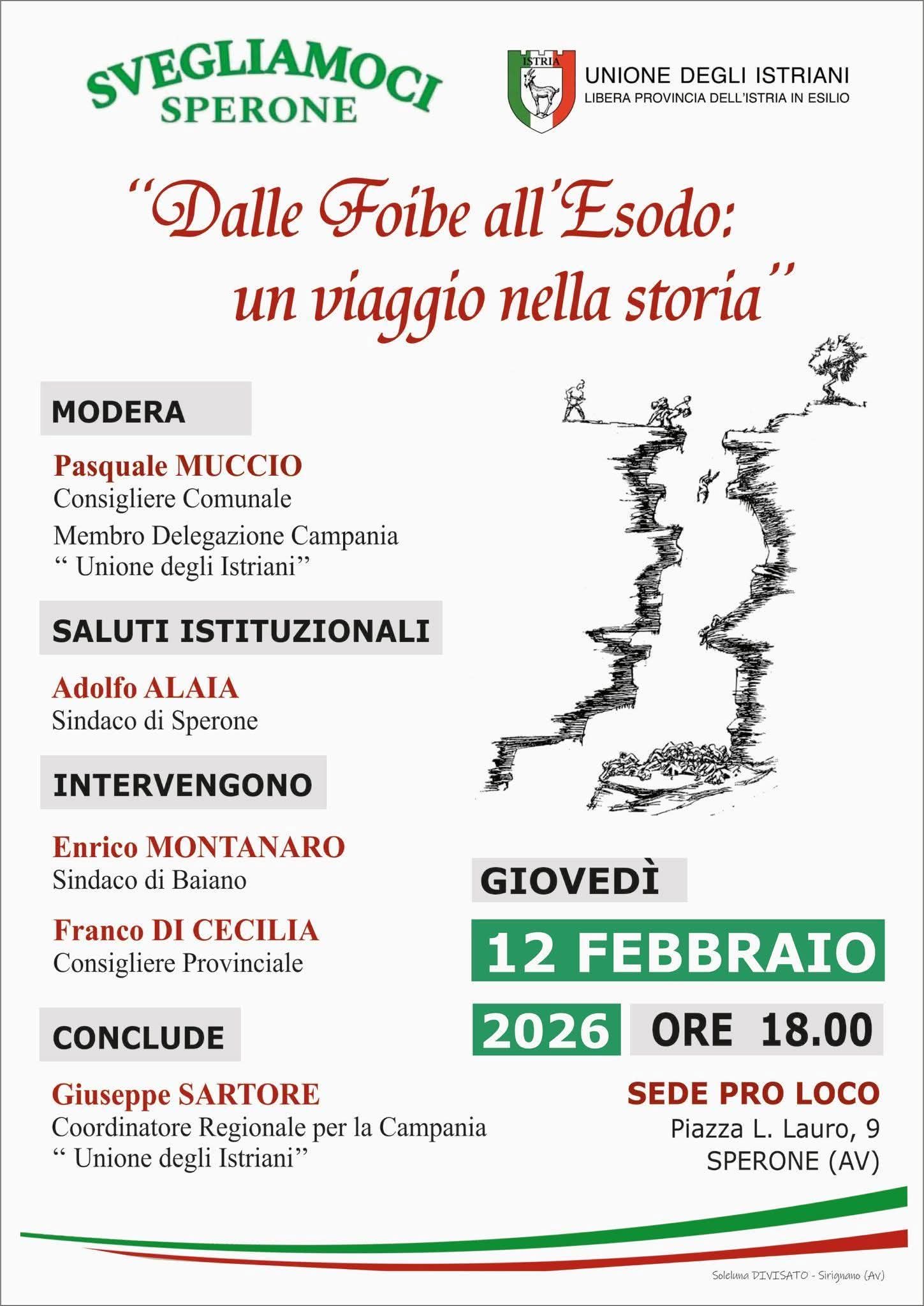 Un momento di approfondimento storico e memoria civile quello in programma giovedì 12 febbraio 2026 alle ore 18:00 presso la sede della Pro Loco in Piazza L. Lauro, 9 a Sperone (AV).