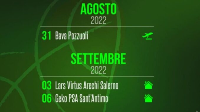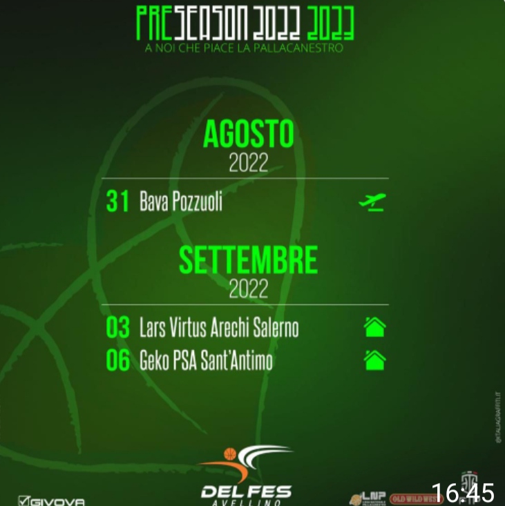 La ASD Del Fes rende noto il programma della preseason per la stagione agonistica 2022/2023. I biancoverdi si ritroveranno in città il 18 di agosto. Il primo allenamento si svolgerà venerdì 19 agli ordini di coach Giovanni Benedetto coadiuvato dal suo staff tecnico formato dagli assistenti Salvatore Formato, Antonio Curcio ed il preparatore atletico Massimo Picariello.