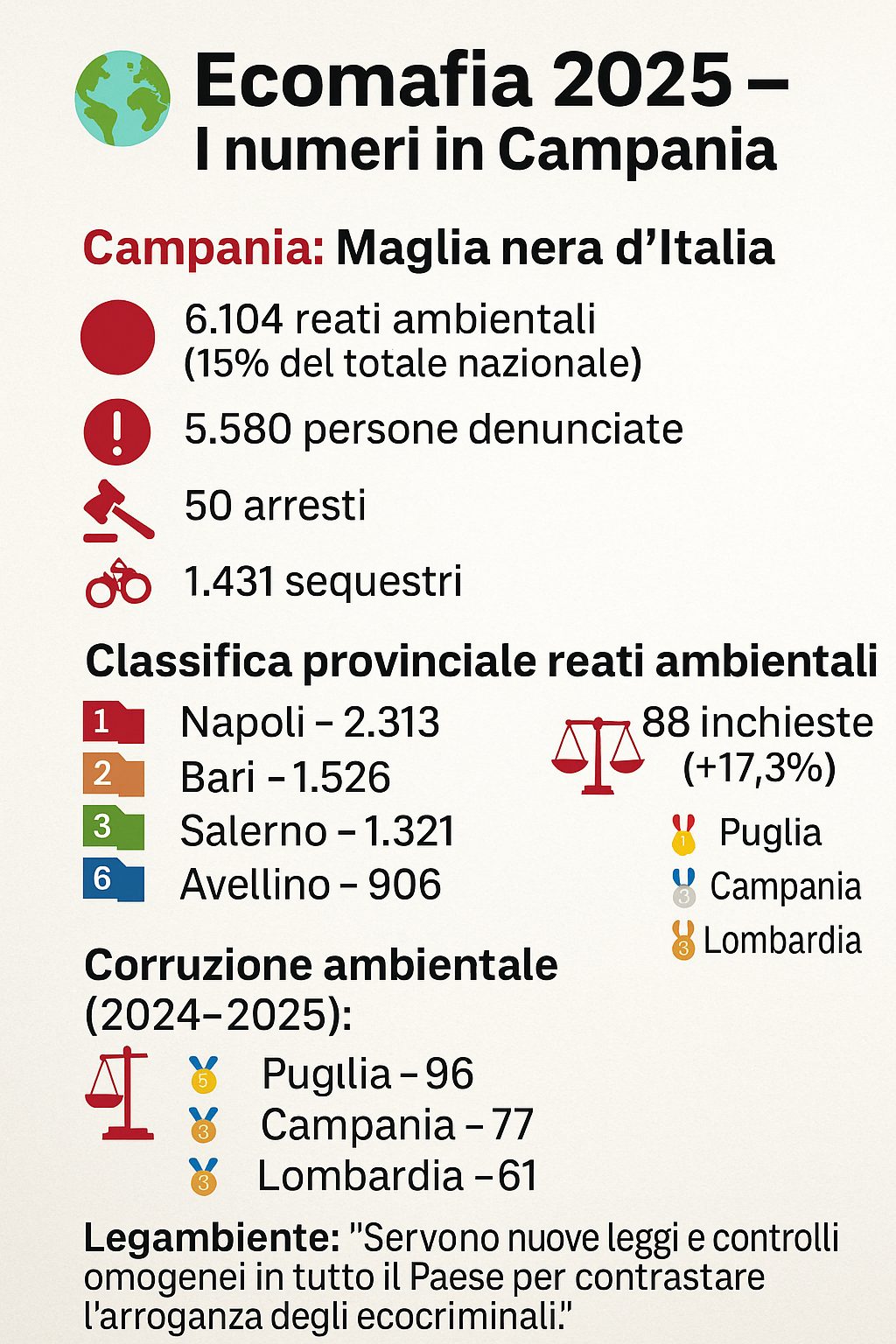 A livello provinciale, Napoli è la peggiore d’Italia, con 2.313 reati ambientali, seguita da Bari (1.526) e da una crescente Salerno, che conquista il terzo posto nazionale con 1.321 illeciti, rispetto al quinto dello scorso anno.