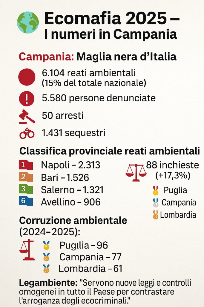 La Campania si conferma ancora una volta la regione italiana con il più alto numero di reati ambientali. A sancirlo è il nuovo dossier “Ecomafia 2025” di Legambiente, presentato oggi a Roma, che traccia un quadro allarmante sullo stato dell’illegalità ambientale nel Paese.