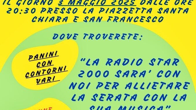 Durante l’evento sarà possibile degustare panini farciti, pietanze con contorni vari, la classica e sempre amata penna all’arrabbiata, e tante altre specialità gastronomiche. Immancabile il tocco dolce a fine pasto: dolci per tutti, per chiudere la serata con golosità e buon umore.