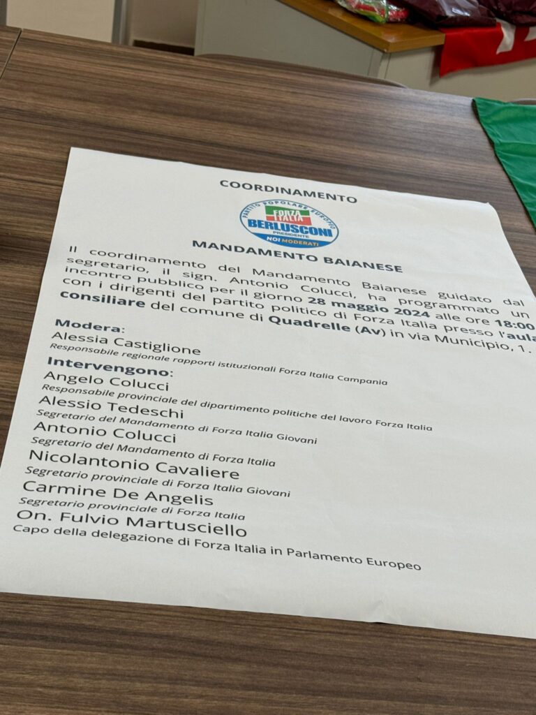 28 Maggio a Quadrelle Fulvio Martusciello per le europee : il voto del 8-9 Giugno è un voto importante e votare Forza Italia significa votare chi rappresenta l’Italia in Europa perché Forza Italia è l’unico partito che fa parte del partito popolare europeo , partito di maggioranza ciò significa tutti il gli altri partiti fanno parte della minoranza.
