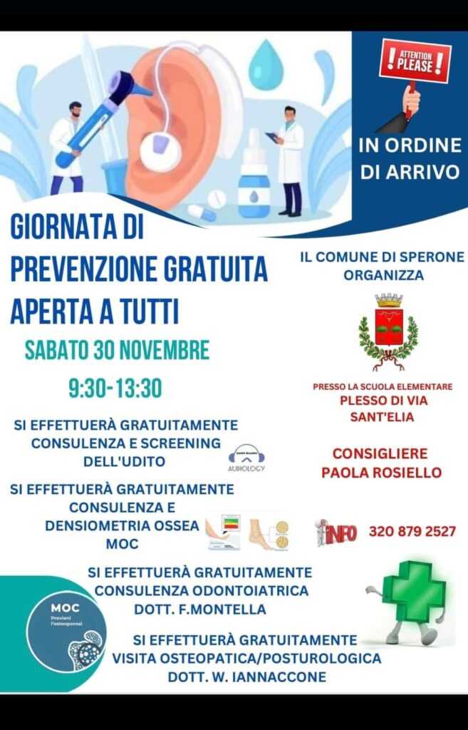 Si svolgerà oggi, sabato 30 novembre, presso il plesso di via Sant’Elia della scuola elementare di Sperone, la “Giornata di Prevenzione Gratuita” organizzata dal Comune con il supporto del consigliere Paola Rosiello.