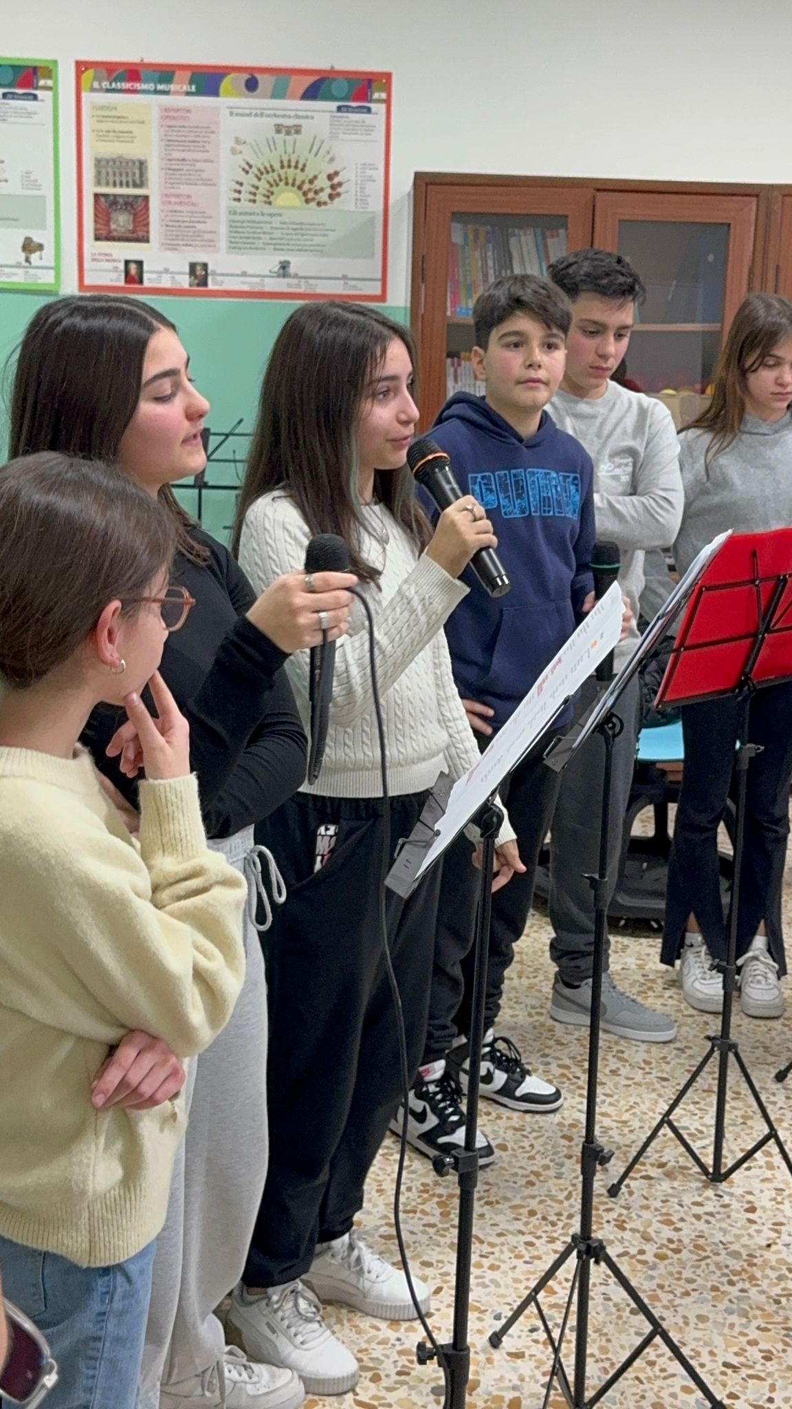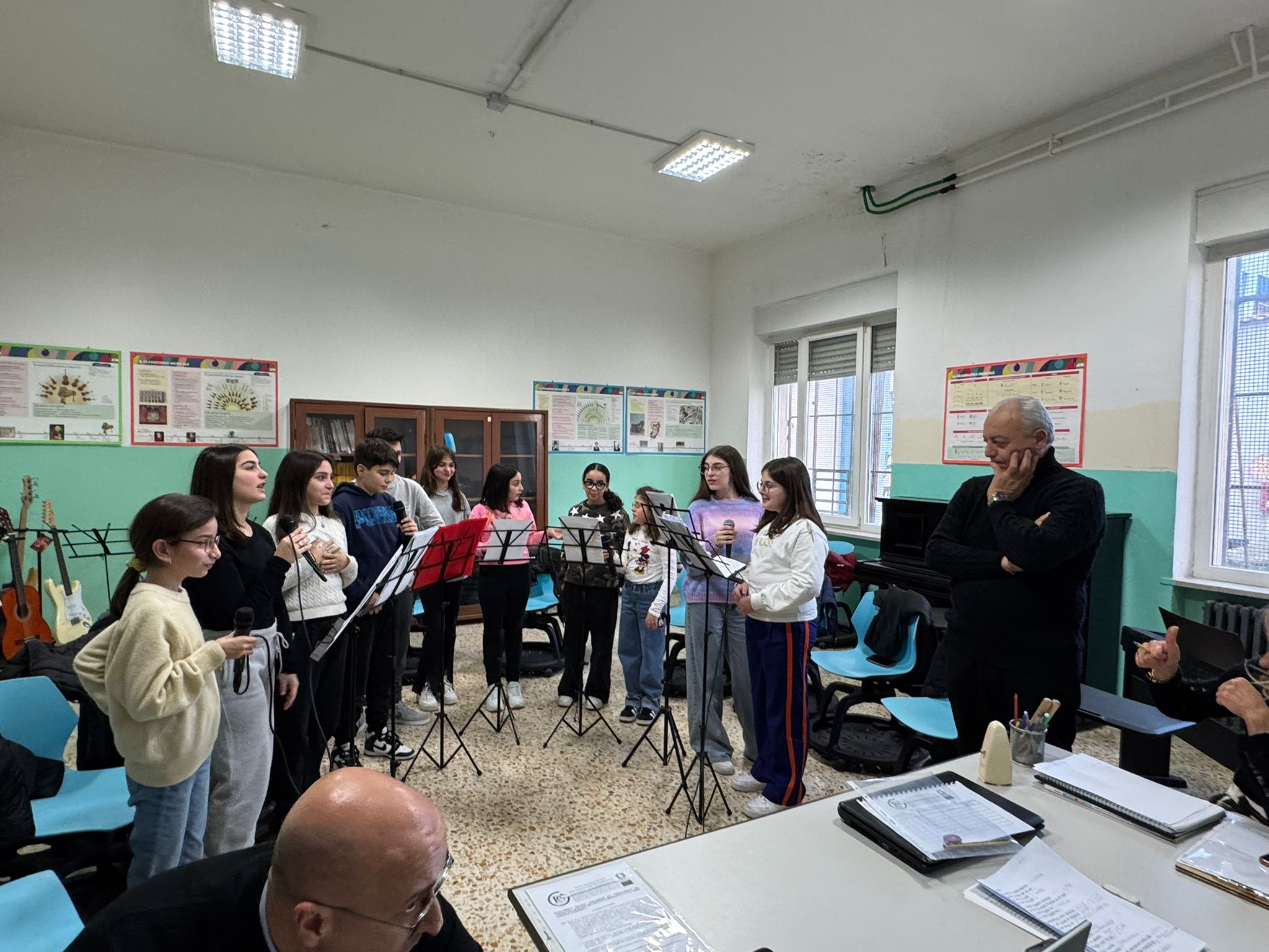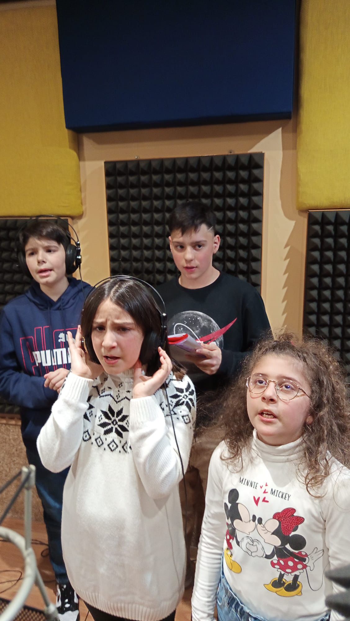 Oggi si è svolto nel plesso della scuola secondaria di I grado, un incontro organizzativo con i genitori e poi il coro si è recato nello studio Amarcord di Marigliano per la registrazione e l’incisione della canzone.