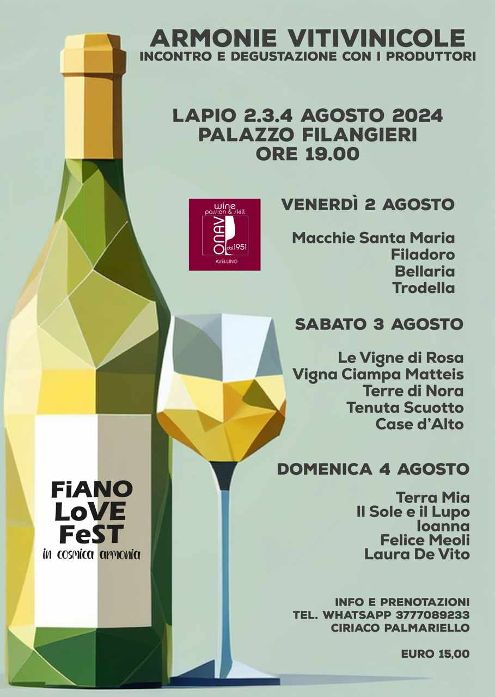 È tutto pronto per la tredicesima edizione del Fiano Love Fest “In Cosmica Armonia”, il 2, 3 e 4 agosto, a Lapio, patria del Fiano di Avellino DOCG che sarà al centro dell’evento con banchi d’assaggio aperti durante tutto l’evento, insieme ai suoi prodotti tipici, ricette del territorio, eccellenze gastronomiche. Inoltre per gli appassionati e i professionisti sono in programma: le degustazioni tecniche su prenotazione, “Armonie Vitivinicole”, un incontro con i produttori in cui si affronteranno i diversi aspetti del Fiano di Avellino DOCG dove sapori, aromi, storie e tradizioni si uniscono in un’armonia perfetta. Le degustazioni tecniche sono guidate da ONAV Avellino (Organizzazione Nazionale Assaggiatori Vino), tutti i giorni, alle ore 19.00 al Palazzo Filangieri di origine normanna, che con la sua architettura domina il centro storico. In degustazione le ultime annate di fiano con i produttori. Venerdì 2 agosto si avrà l’opportunità di degustare il Fiano e di porre domande, quesiti e curiosità ai produttori delle aziende: Macchie Santa Maria, Filadoro, Bellaria, Trodella. Sabato 3 agosto intervengono i produttori delle cantine: Le Vigne di Rosa, Vigna Ciampa Matteis, Terre di Nora, Tenuta Scuotto, Case d’Alto. Domenica 4 agosto si potrà invece degustare il fiano delle aziende: Terra Mia, Il Sole e il Lupo, Ioanna, Felice Meoli, Laura De Vito. (Per partecipare è necessario prenotare al numero 3777089233 Ciriaco Palmariello).