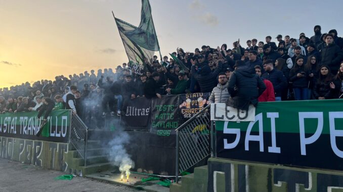 La tifoseria neroverde ha dato il meglio di sé, dall’inizio alla fine della partita, sostenendo la squadra che rischia la retrocessione. In campo i ragazzi hanno giocata la loro partita del cuore contro la terza in classifica ottenendo il risultato di 2 a 2.