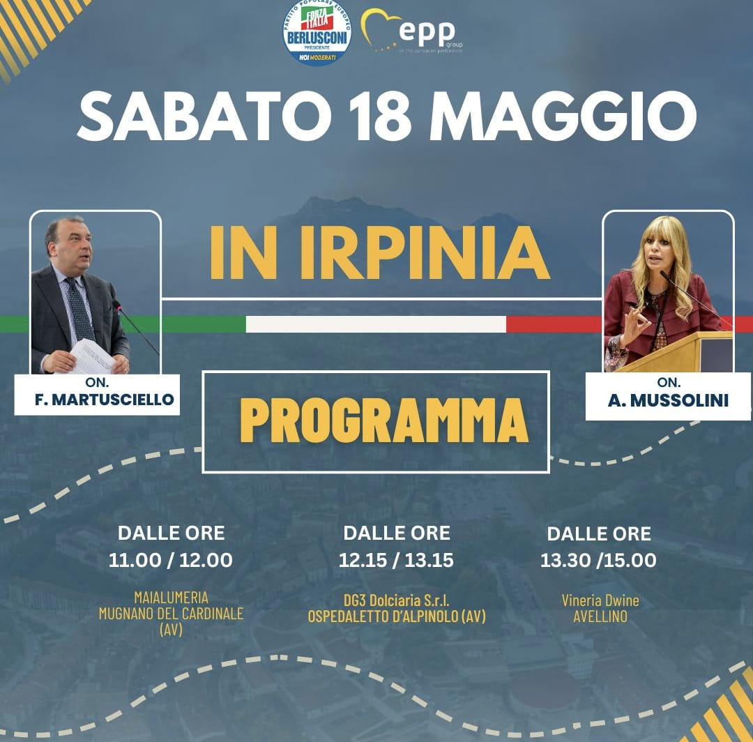 “Sabato 18 Maggio dalle ore 11.00, ospiteremo in Irpinia il nostro Segretario regionale On. Fulvio Martusciello, capo delegazione di Forza Italia al parlamento europeo e l’On. Alessandra Mussolini europarlamentare, entrambi candidati al Parlamento Europeo. La giornata prenderà inizio con un tour presso alcune aziende irpine e terminerà in Piazza Libertà ad Avellino presso la vineria Dwine dove simpatizzanti, militanti e dirigenti di partito avranno modo di confrontarsi sulla crescita occupazionale e valorizzazione del Mezzogiorno nell’ottica europeista, ” ad affermarlo è Alessia Castiglione, dirigente regionale di Forza Italia ai rapporti istituzionali.