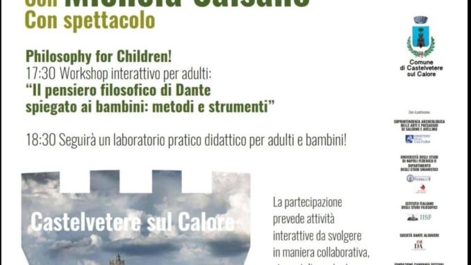 Da un punto di vista contenutistico in occasione della ricorrenza del 700°anniversario della morte di Dante Alighieri si pone l’accento sul pensiero filosofico e sulle tematiche attualizzate del pensiero del grande poeta della lingua italiana. Il progetto prevede l’organizzazione di convegni e attività divulgative laboratoriali da svolgersi in 15 comuni della provincia di Avellino individuati per la corrispondenza alla definizione di borgo e per il pregio dei luoghi in corrispondenza con il titolo della manifestazione. Giovedì 28 ottobre alle ore 17.30 a Castelvetere sul Calore ci sarà l’evento culturale “Dante Filosofico” che prevede laboratori di filosofia e spettacolo con la partecipazione di Michela Salsano. Alle 17.30 ci sarà il workshop interattivo per gli adulti “Il pensiero filosofico di Dante spiegato ai bambini: metodi e strumenti”, alle 18.30 a seguire, un laboratorio pratico didattico per adulti e bambini. La partecipazione prevede attività interattive da svolgere in maniera collaborativa, si consiglia pertanto di munirsi di un album da disegno e pastelli colorati. Info e prenotazioni : [email protected]