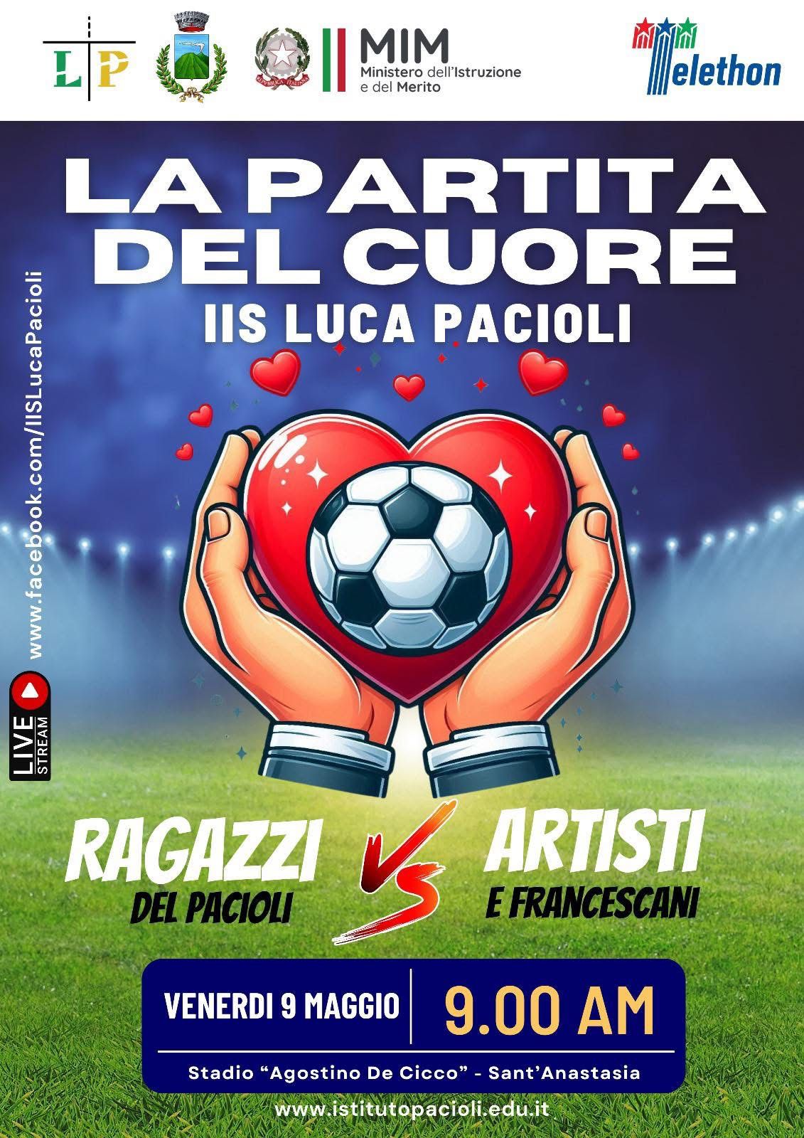 L’Istituto di Istruzione Superiore “Luca Pacioli” rinnova anche quest’anno il suo impegno a favore della solidarietà con “La Partita del Cuore”, evento benefico a sostegno della Fondazione Telethon, impegnata nella ricerca scientifica per la cura delle malattie genetiche rare.