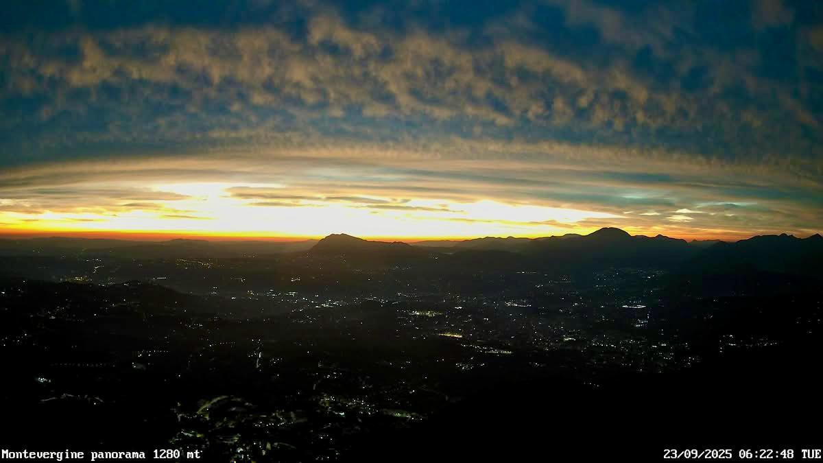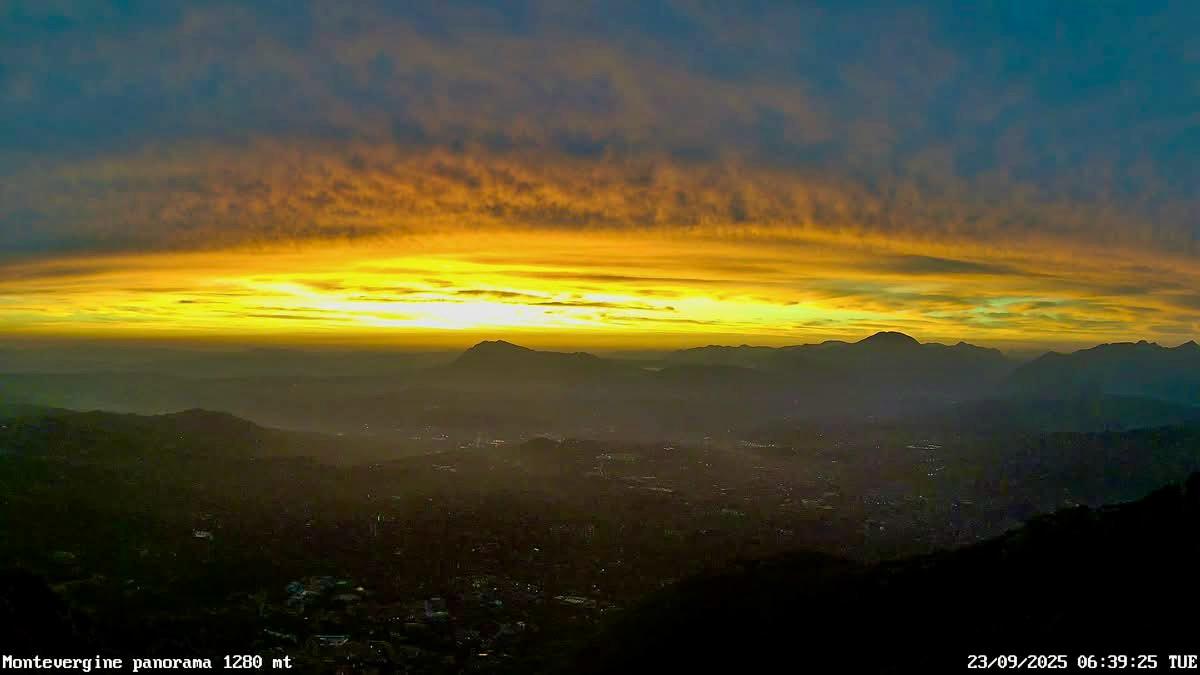 Dal santuario arroccato a 1.280 metri di altitudine, lo sguardo si apre sulla conca avellinese, dove le ultime ombre della notte cedono lentamente il passo alle prime luci del giorno. Le fotografie catturate mostrano un cielo dipinto di sfumature intense: dall’oro al rosso acceso, che si fondono con i blu profondi della notte ancora presente. Le nuvole, sospese come veli sottili, amplificano lo spettacolo cromatico, creando giochi di luce e riflessi che mutano minuto dopo minuto.