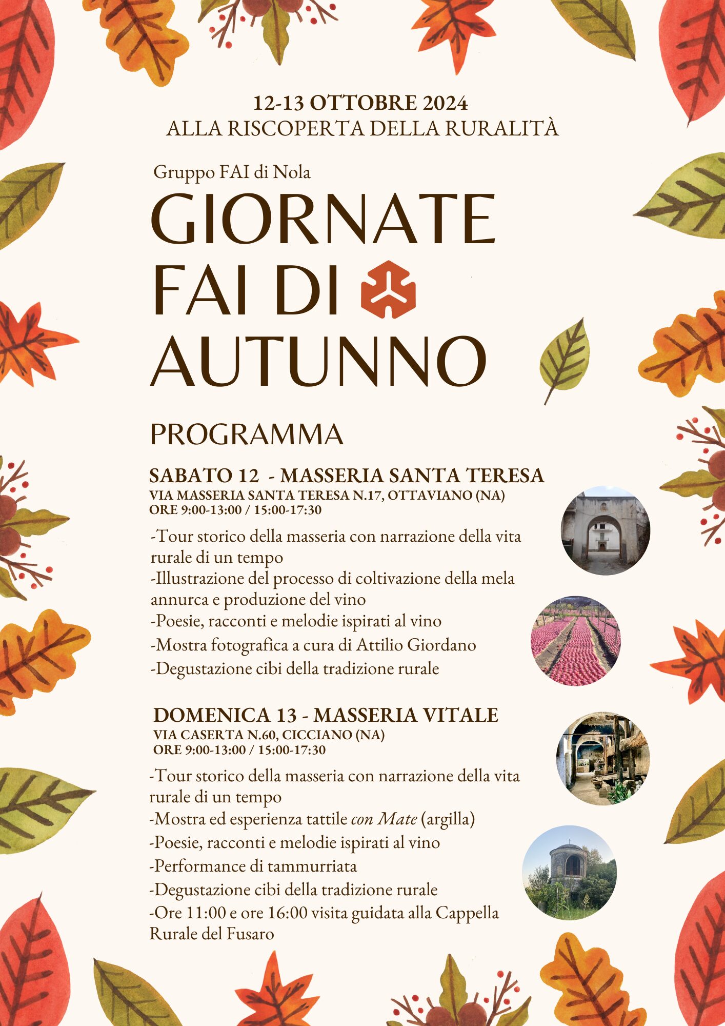Il Gruppo FAI di Nola, in occasione delle Giornate FAI d’Autunno 2024 – uno dei più importanti e amati eventi di piazza dedicati al patrimonio culturale e paesaggistico del nostro Paese -, ha deciso di portare l’attenzione su due antiche masserie rurali del territorio agro-nolano, testimonianze preziose di un passato agricolo che ha profondamente caratterizzato l’identità della zona. Sabato 12 e domenica 13 ottobre per la prima volta, la masseria Santa Teresa di Ottaviano e la Masseria Vitale di Cicciano saranno aperte al pubblico, offrendo un’opportunità unica per riscoprire un patrimonio architettonico e culturale legato alla vita contadina e alla gestione del territorio.