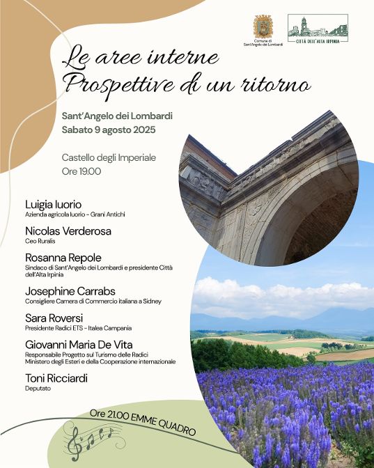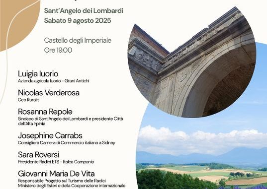 Si parlerà di scambi e relazioni commerciali, ma anche di turismo di ritorno, nel convegno di Sant’Angelo dei Lombardi “Le aree interne, prospettive di un ritorno”. L’evento si terrà sabato 9 agosto, alle ore 19:00 presso il Castello degli Imperiale, e vedrà la partecipazione di imprenditori, di rappresentanti del commercio, della politica, del mondo delle istituzioni. Organizzata da Comune di Sant’Angelo dei Lombardi e Città dell’Alta Irpinia, la serata inizierà con due testimonianze dall’Alta Irpinia. Interverranno Luigia Iorio, dell’azienda agricola Iuorio – Grani Antichi, e di Nicolas Verderosa, Ceo di Ruralis. Si proseguirà con l’intervento di Rosanna Repole, sindaco di Sant’Angelo dei Lombardi e presidente della Città dell’Alta Irpinia, e di Josephine Carrabs, consigliera della Camera di Commercio italiana a Sidney. Di turismo delle radici, ma non solo, relazioneranno Sara Roversi, presidente Radici Ets – Italea Campania, e Giovanni Maria De Vita, responsabile Progetto sul Turismo delle Radici presso il Ministero degli Esteri e della Cooperazione internazionale. Al convegno parteciperà inoltre Toni Ricciardi, deputato della Repubblica. A seguire intrattenere musicale di Emme Quadro.