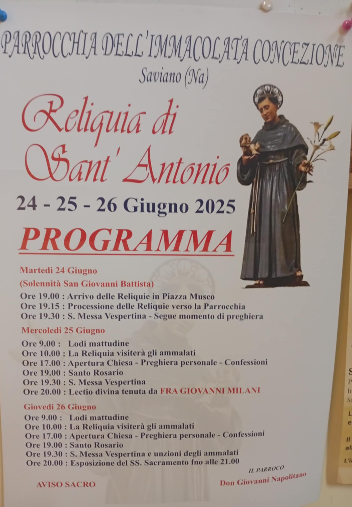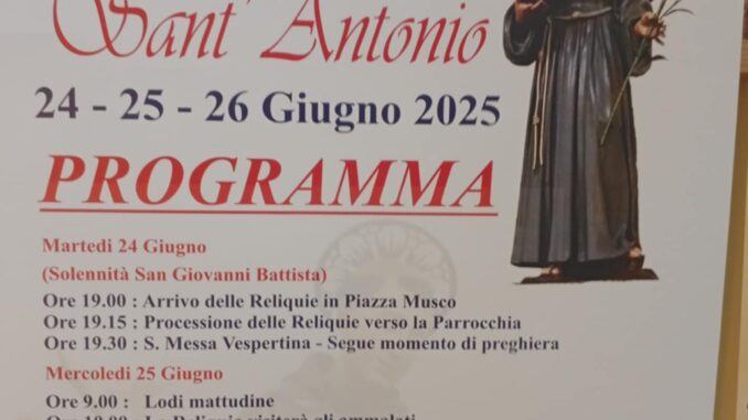 Saviano (NA) – La comunità parrocchiale dell’Immacolata Concezione di Saviano si prepara ad accogliere le reliquie di Sant’Antonio, in un evento di intensa spiritualità che si terrà nei giorni 24, 25 e 26 giugno 2025. Il programma, ricco di momenti liturgici e di preghiera, offrirà ai fedeli l’occasione di rinnovare la propria devozione verso uno dei santi più amati della tradizione cristiana.