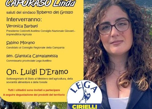 Il sottosegretario all’Agricoltura Luigi D’Eramo fa tappa in Irpinia: domani, giovedì 6 novembre, a Roccabascerana, sarà l’ospite d’onore di un incontro elettorale organizzato dalla Lega. “Il potenziale delle aree interne” è il tema scelto da Linda Caporaso, uno dei quattro candidati irpini alle Regionali del 23 e 24 novembre prossimi. L’appuntamento è per le 19:45 al Centro Arte e Cultura di Roccabascerana. La serata sarà aperta dai saluti del sindaco Roberto Del Grosso; poi interverranno l’imprenditrice agricola Veronica Barbati, presidente Coldiretti Avellino del Consiglio nazionale giovani; Sabino Morano, vicecommissario provinciale della Lega e anche lui candidato alle Regionali; il senatore della Lega Gianluca Cantalamessa, commissario provinciale della Lega Avellino; e il sottosegretario di Stato al Ministero dell’Agricoltura della Sovranità alimentare e delle Foreste Luigi D’Eramo.