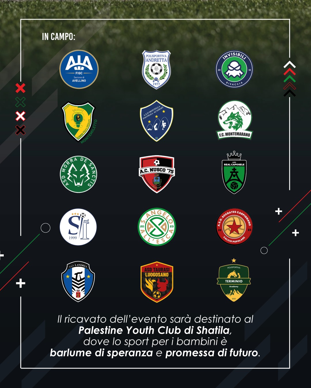 Saranno 14 squadre irpine, dai campionati di Eccellenza fino alla Terza Categoria, a mettere a disposizione i propri giocatori per formare due formazioni miste. In totale 70 calciatori scenderanno in campo, con cambi previsti ogni 30 minuti, sotto la direzione di un arbitro dell’AIA di Avellino. A dare ulteriore prestigio all’evento ci sarà anche il Presidente nazionale dell’AIAC, Renzo Ulivieri, da tempo impegnato in appelli alle istituzioni sportive internazionali affinché Israele venga esclusa dalle competizioni.