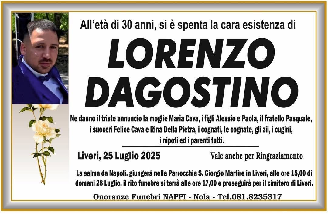 Liveri, 25 luglio 2025 – Si è spento improvvisamente all’età di 30 anni Lorenzo Dagostino, giovane padre, marito e amico stimato da tutti. A darne il triste annuncio la moglie Maria Cava, i figli Alessio e Paola, il fratello Pasquale, i suoceri Felice Cava e Rina Della Pietra, insieme a tutta la famiglia, parenti e amici che ne piangono la prematura scomparsa.