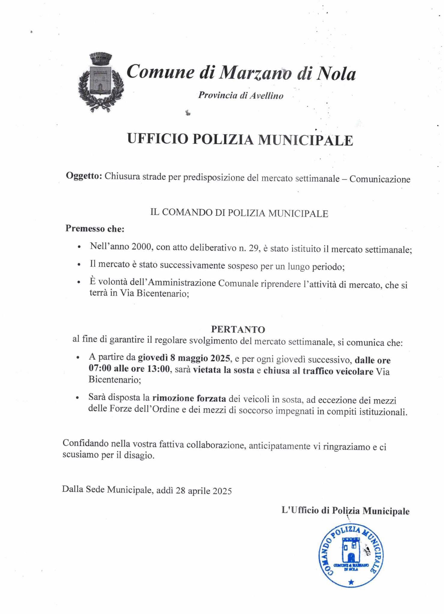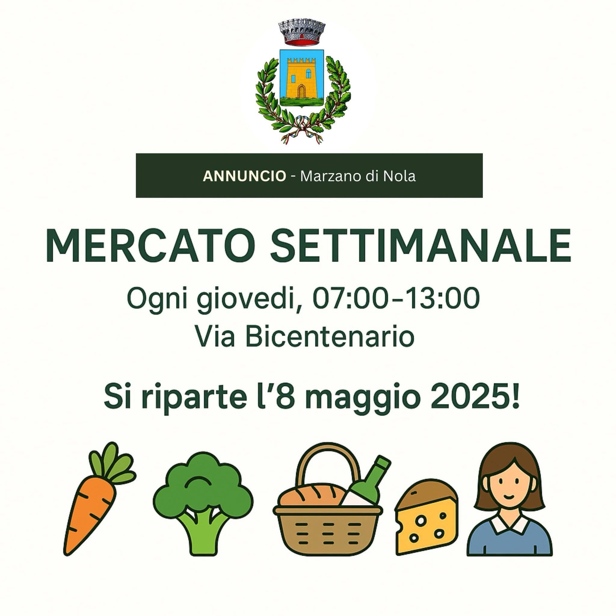 A partire da giovedì 8 maggio 2025, riparte a Marzano di Nola il mercato settimanale, istituito originariamente nel 2000 e sospeso da tempo. L’iniziativa, fortemente voluta dall’Amministrazione Comunale, punta a rilanciare un’importante tradizione commerciale del paese, offrendo ai cittadini un nuovo spazio di socialità e acquisti.