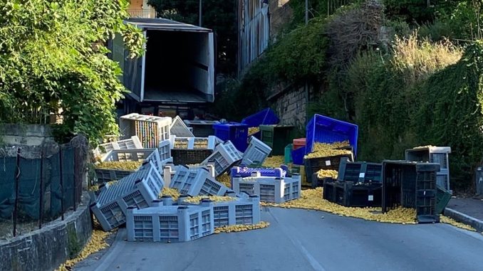 Mercogliano, strada bloccata da un carico frutta caduto da un camion nei pressi della Chiesa di San Modestino