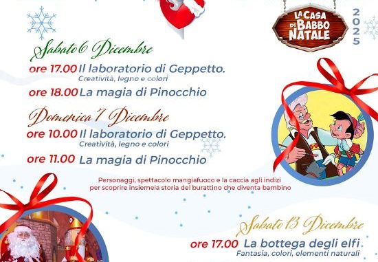 Dal 6 al 21 dicembre a Mercogliano, presso la sede della Pro Loco, sarà allestito un piccolo villaggio di Natale per ospitare laboratori creativi gratuiti a tema (all’interno), i personaggi della favola di Pinocchioartisti di strada e una nuova e accogliente casetta per l’arrivo del protagonista più atteso: Babbo Natale.