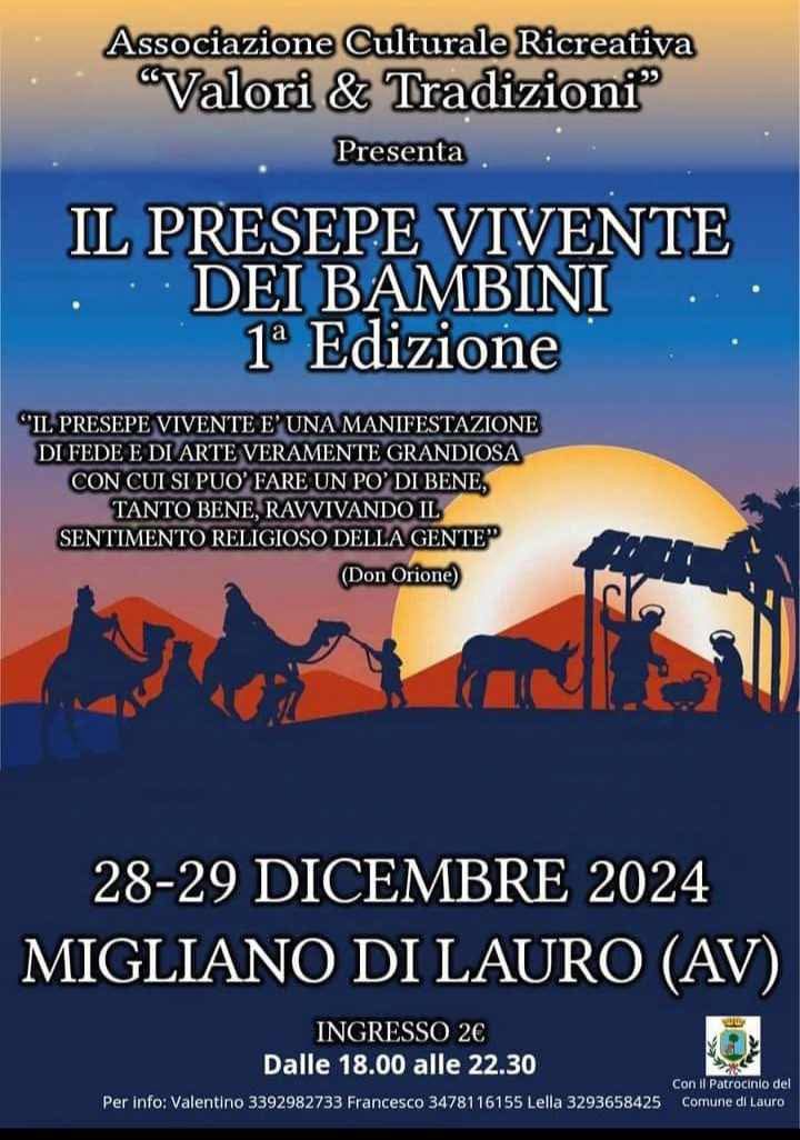 Un evento unico e suggestivo attende la comunità di Migliano di Lauro e tutti i visitatori: la prima edizione del Presepe Vivente dei Bambini, in programma il 28 e 29 dicembre. L’iniziativa, organizzata dall’associazione Valori & Tradizioni, promette di regalare un’esperienza indimenticabile in un’atmosfera di magia e tradizione.